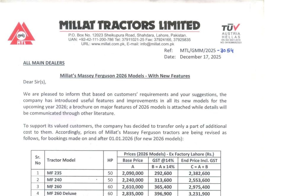 Millat Tractors Limited – 2026 Massey Ferguson Price Revision